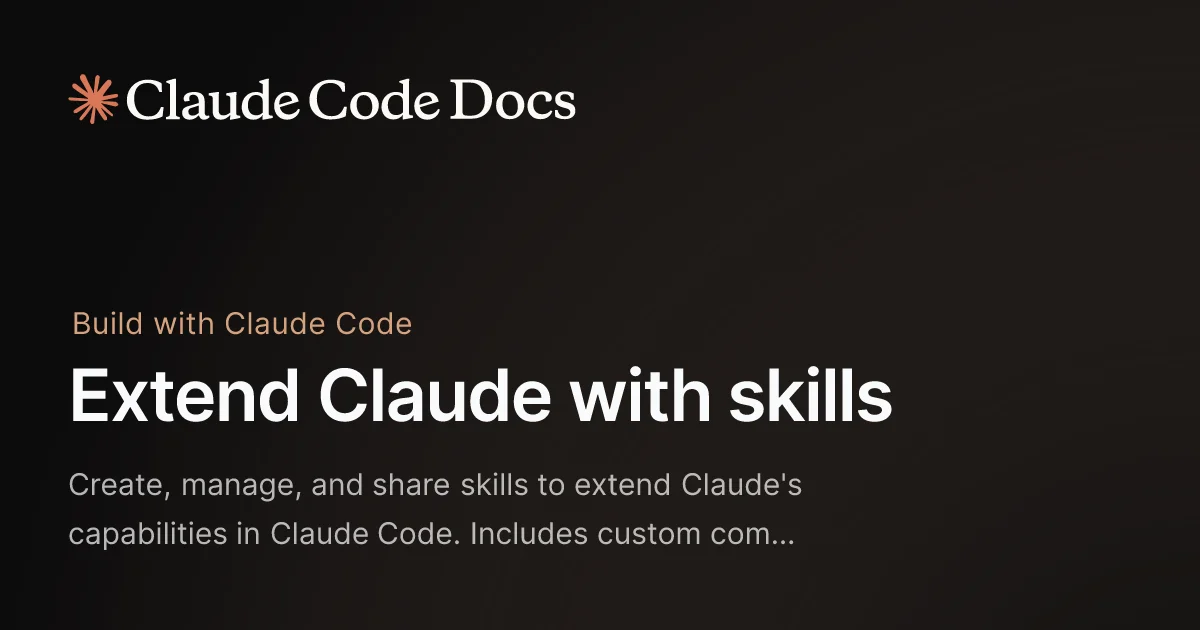 Claude Code Skills documentation: Create, manage, and share skills to extend Claude's capabilities. Source: code.claude.com